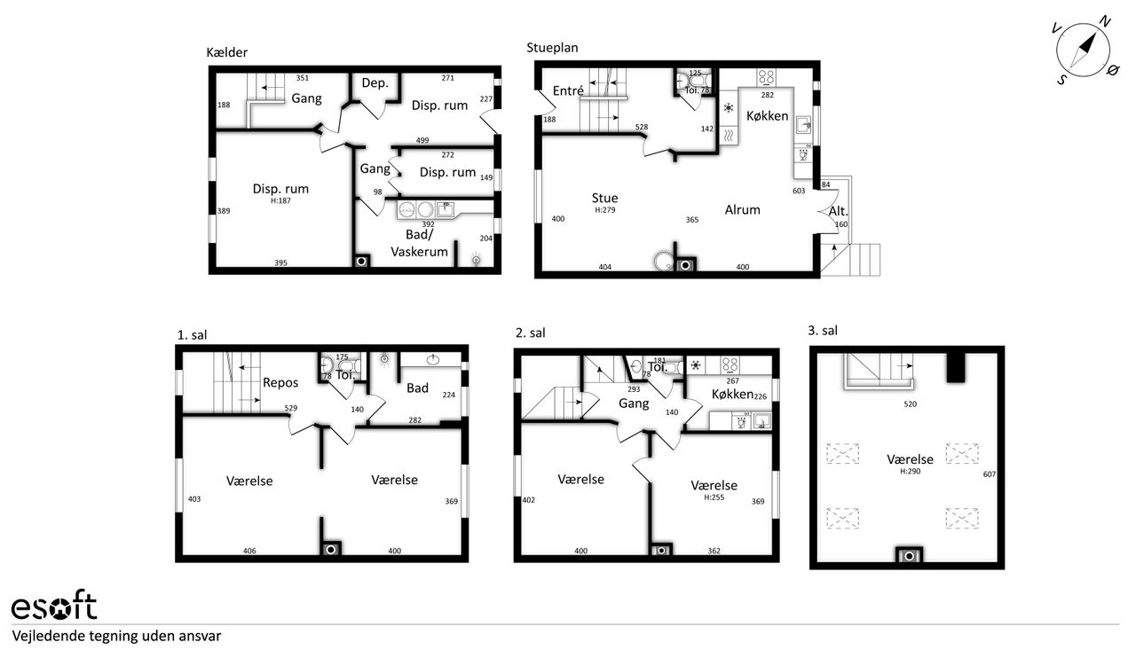 Indretning: Stueetagen er indrettet med entré til skønt køkkenalrum med direkte udgang til haven. I åben forbindelse med køkkenalrummet, er der stor lys stue. Herudover toilet. På 1. sal findes 2 store værelser og badeværelse. 2. sal byder på yderligere 2 værelser, tekøkken og toilet. På 3. sal findes et stort værelse. Herudover en højloftet kælder med 3 disponible rum og baderum.