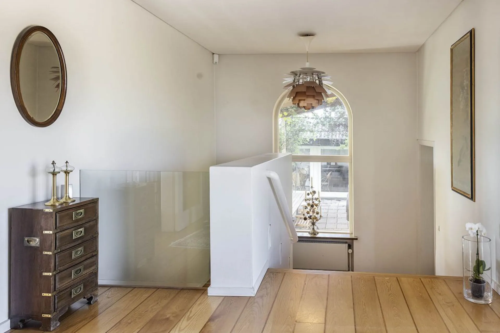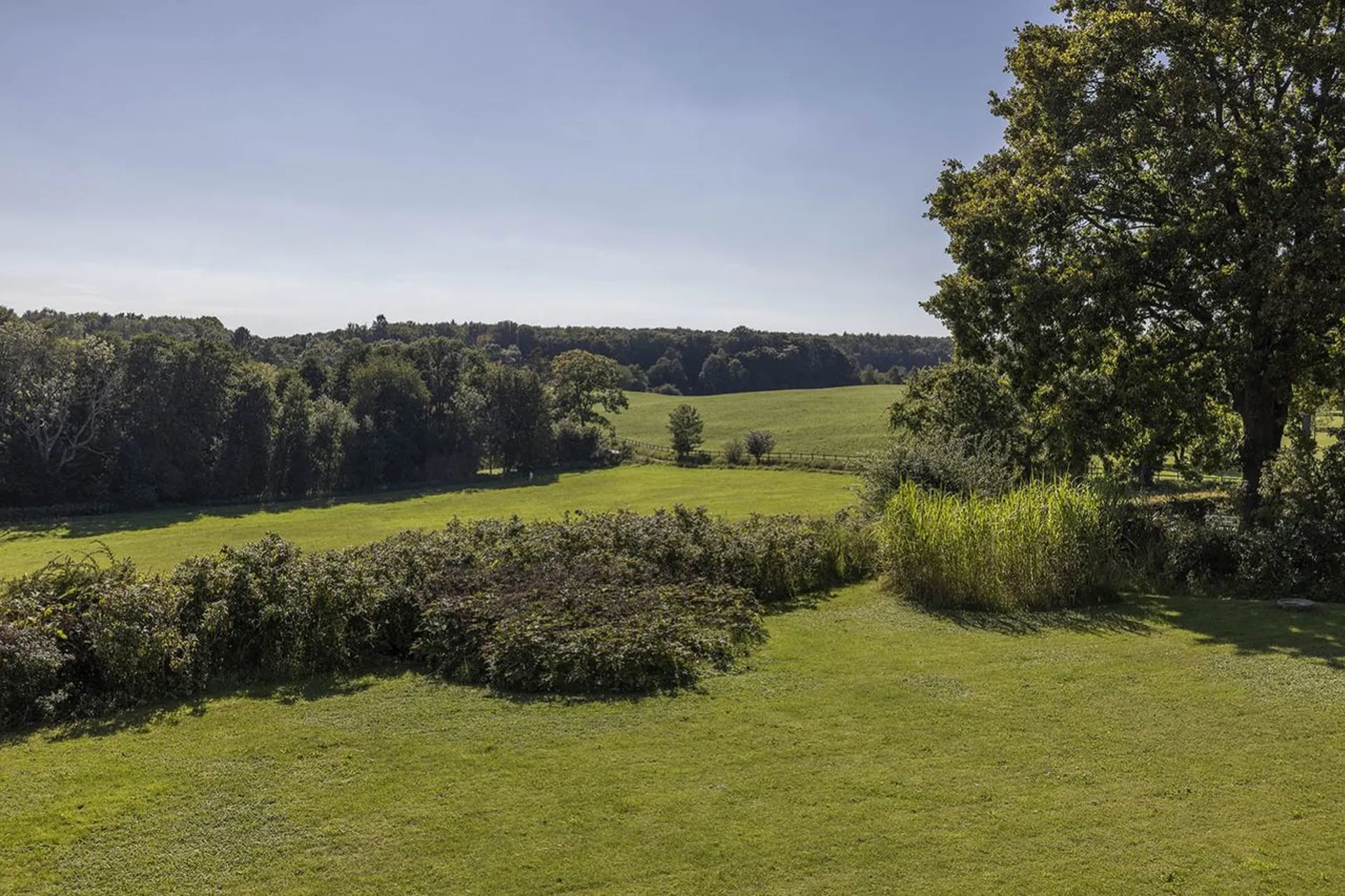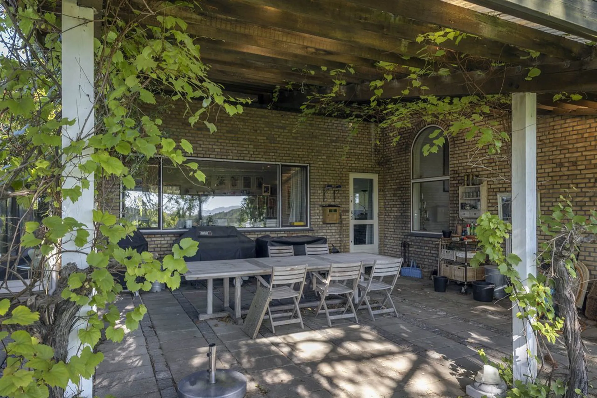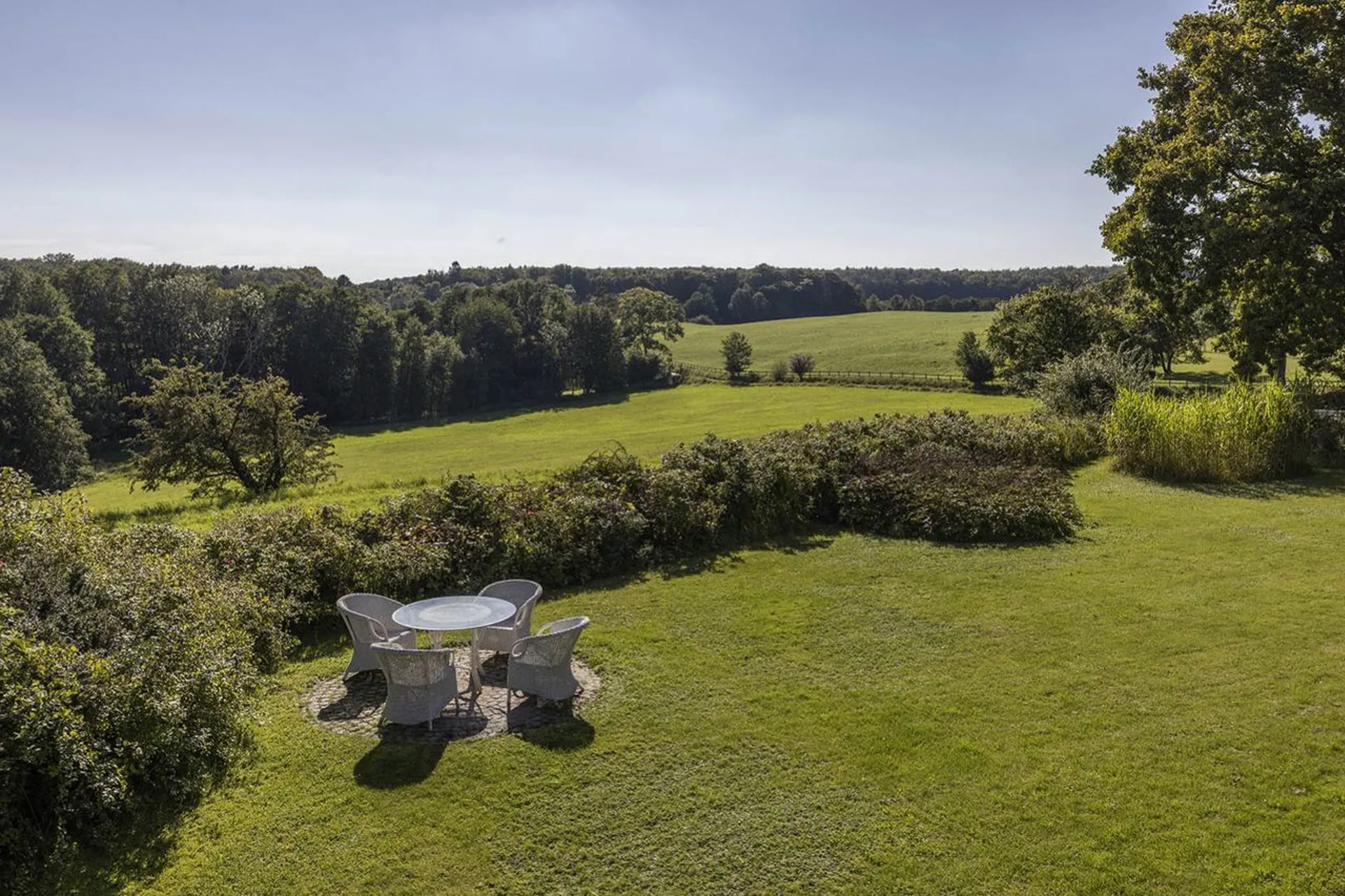 Indretning: Entré/hall til stort alrum; opholdsstue, spisestue og smagfuldt indrettet køkken i ét, hvorfra der er udgang til den skønneste udestue med udsigt over Gedevaserne og et smukt skovbælte som baggrundskulisse. Sideliggende afdeling med forstue, walk-in og stort soveværelse med adgang til luksuriøst indrettet badeværelse med både kar og brus. Fra både soveværelse og forstue/muligt soveværelse er der udgang til en stor sydvendt terrasse, der vender mod haven.