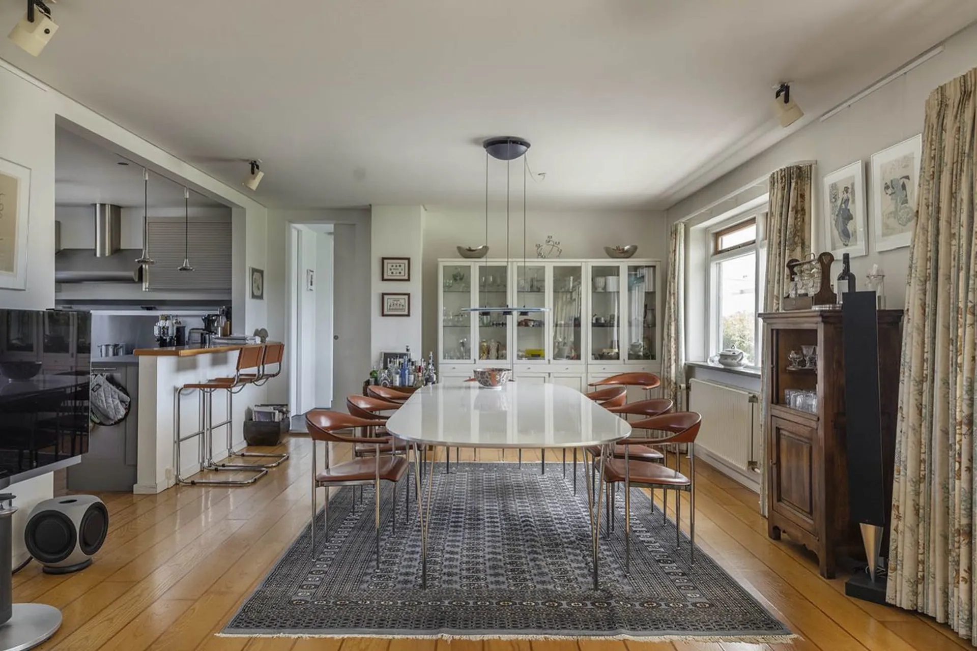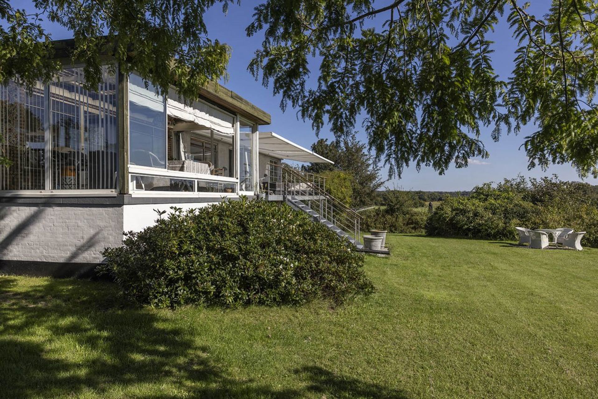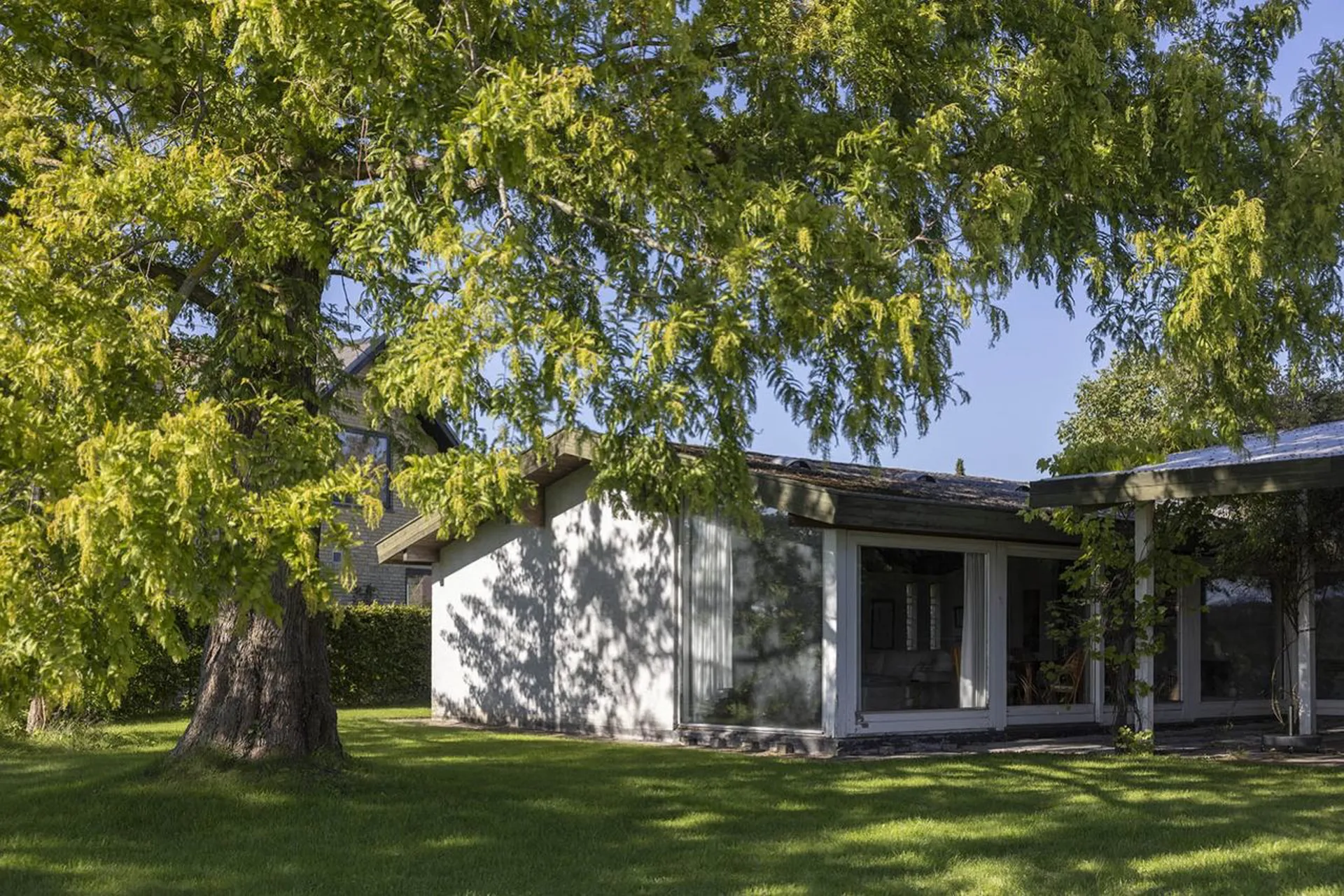 Huset blev opført i 1956, vel nok midt i en af de mest interessante arkitekturhistoriske epoker, og det er lykkedes at skabe en skøn, balanceret fornemmelse af flydende overgange mellem inde- og uderum. Boligens forskudte niveauer, mange terrasser og fabelagtige lysindfald fra alle verdenshjørner skaber en spektakulær bolig ud over det sædvanlige.
