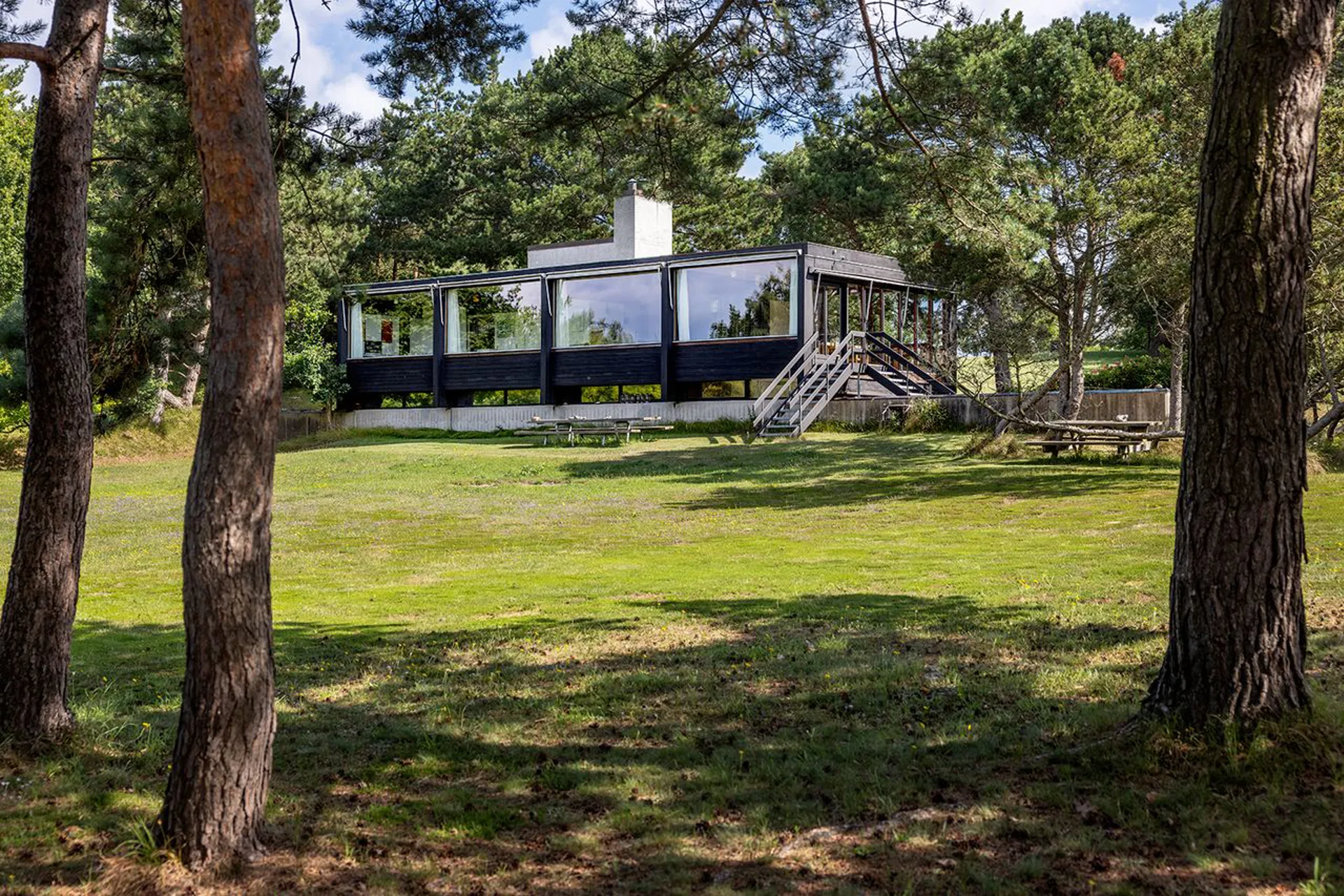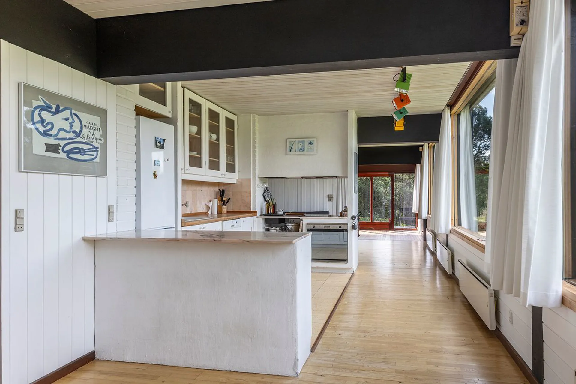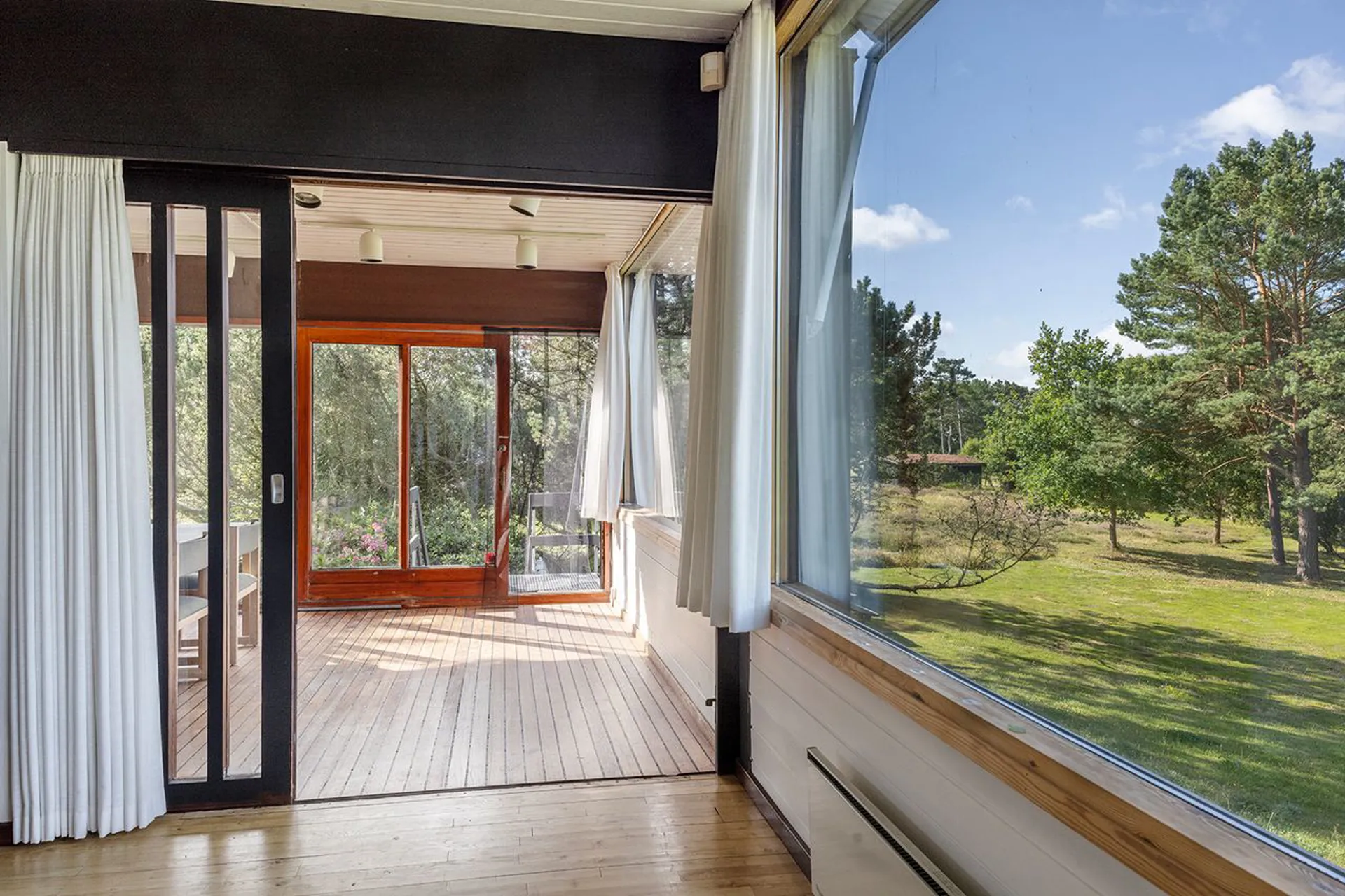 Og det står lige så smukt, som da det blev tegnet. Planløsningen og materialerne består, fordi det gennem årene er blevet passet på og elsket. Hævet over terrænet, vendt mod syd, med store vinduespartier, der fanger solen hele dagen. Naturen tillades at blive en nærgående gæst i huset. Lige der. Lige foran - og lige rundt om. Sådan er det her - naturligt naturrigt.