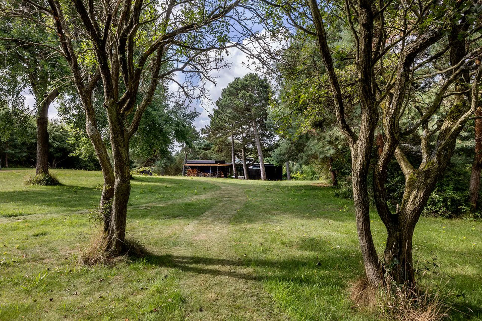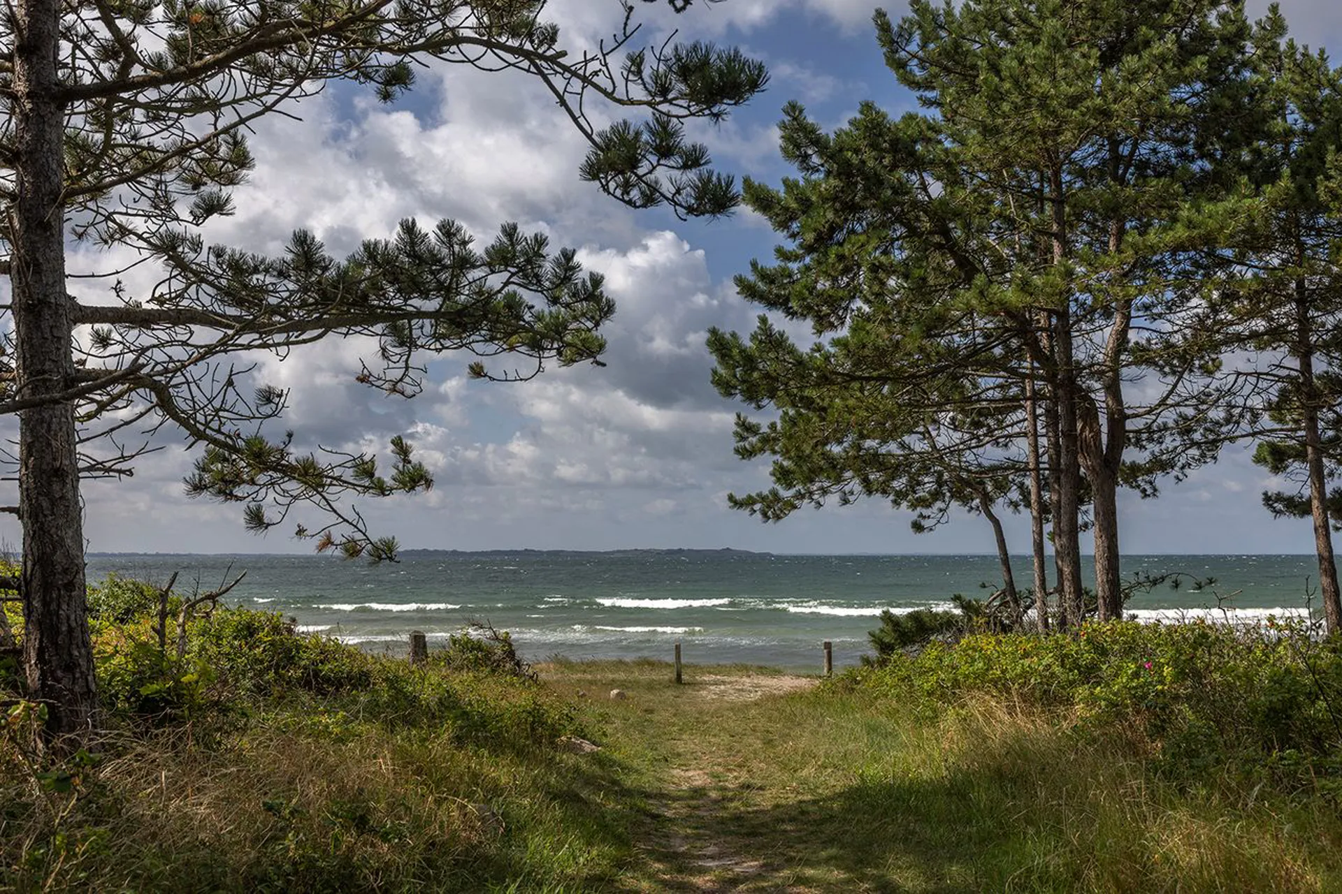 På grunden åbner verden sig. Mod syd: Nekselø Bugts barske vande. Mod nord: Sejerø Bugts stille bølger. Omkring huset: grantræer, der giver læ og privatliv – uden at tage solen.