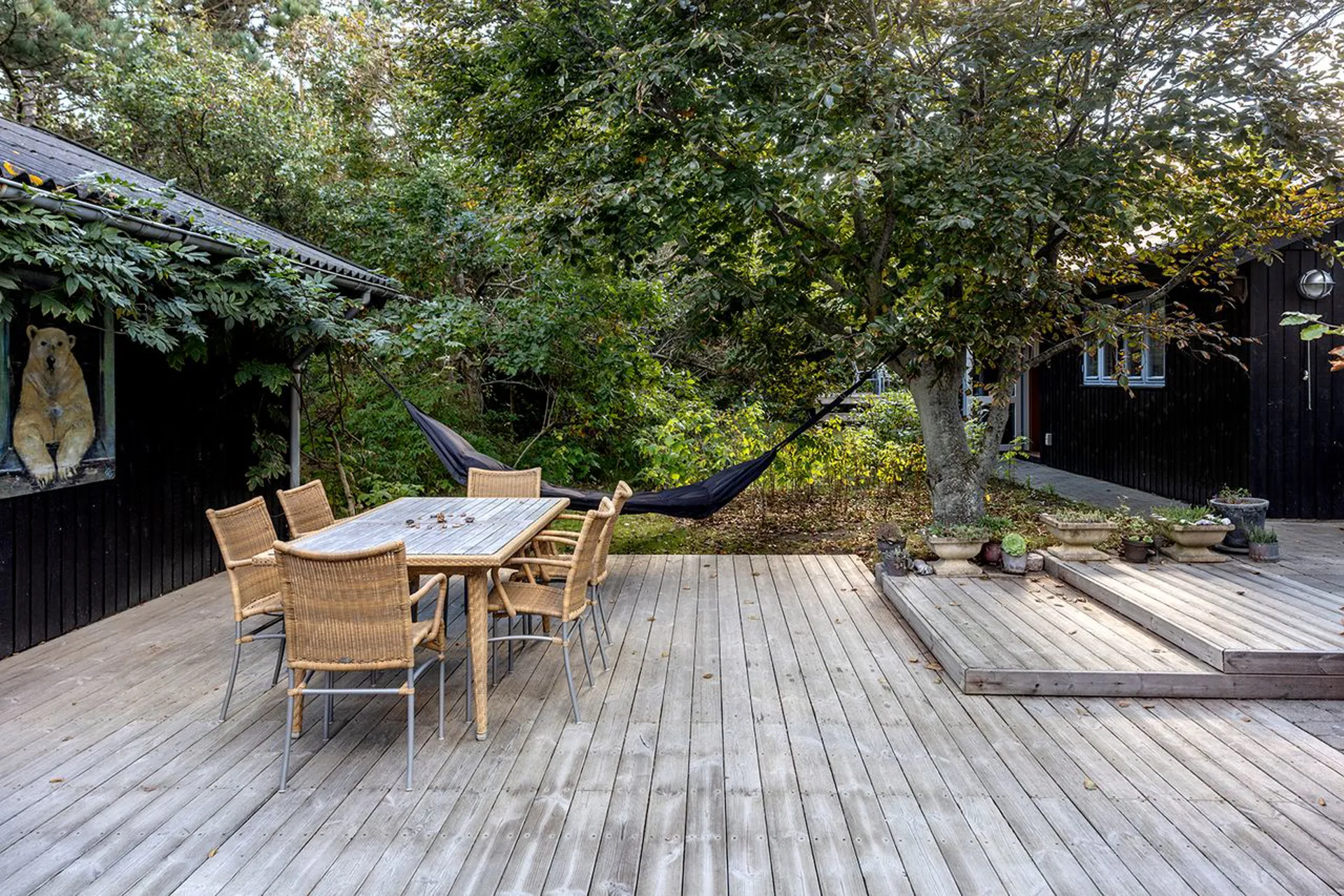 ét af de mange omkringliggende terrasseområder. Fra alrummet er der desuden adgang til køkken og bryggers. Herudover fordelingsgang med tre veldisponerede soveværelser og badeværelse. Yderligere en garage, som er indrettet med disponibelt rum og masser af god plads til opbevaring.