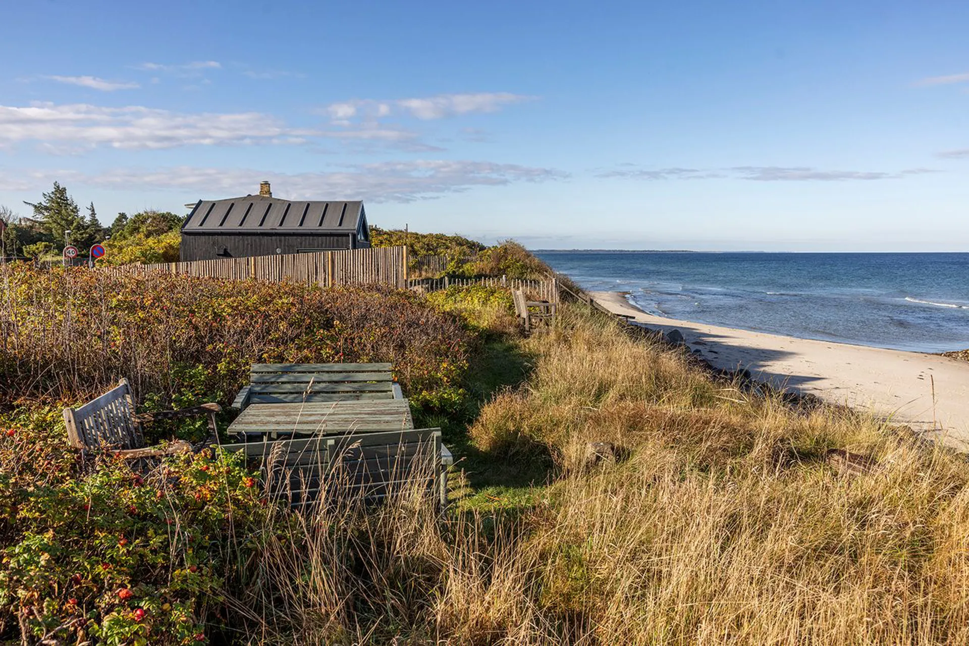 Huset er oprindeligt opført i 1983 og er smukt beliggende omgrænset af gammel, smuk beplantning, fuglekvidder, den stille lyd fra vandet og midt mellem himmel, hav og det smukkeste lys. Lyset! Det er magisk. En floskel, ja, men den er god nok. Og derfor er det sandt. Det er i sandhed eventyrligt. Og sommerhusets store naturgrund er tilmed suppleret med en tilknyttet privat strandgrund, der kun deles med naboen, her er der indrettet et spiseområde med trappe direkte ned til stranden.