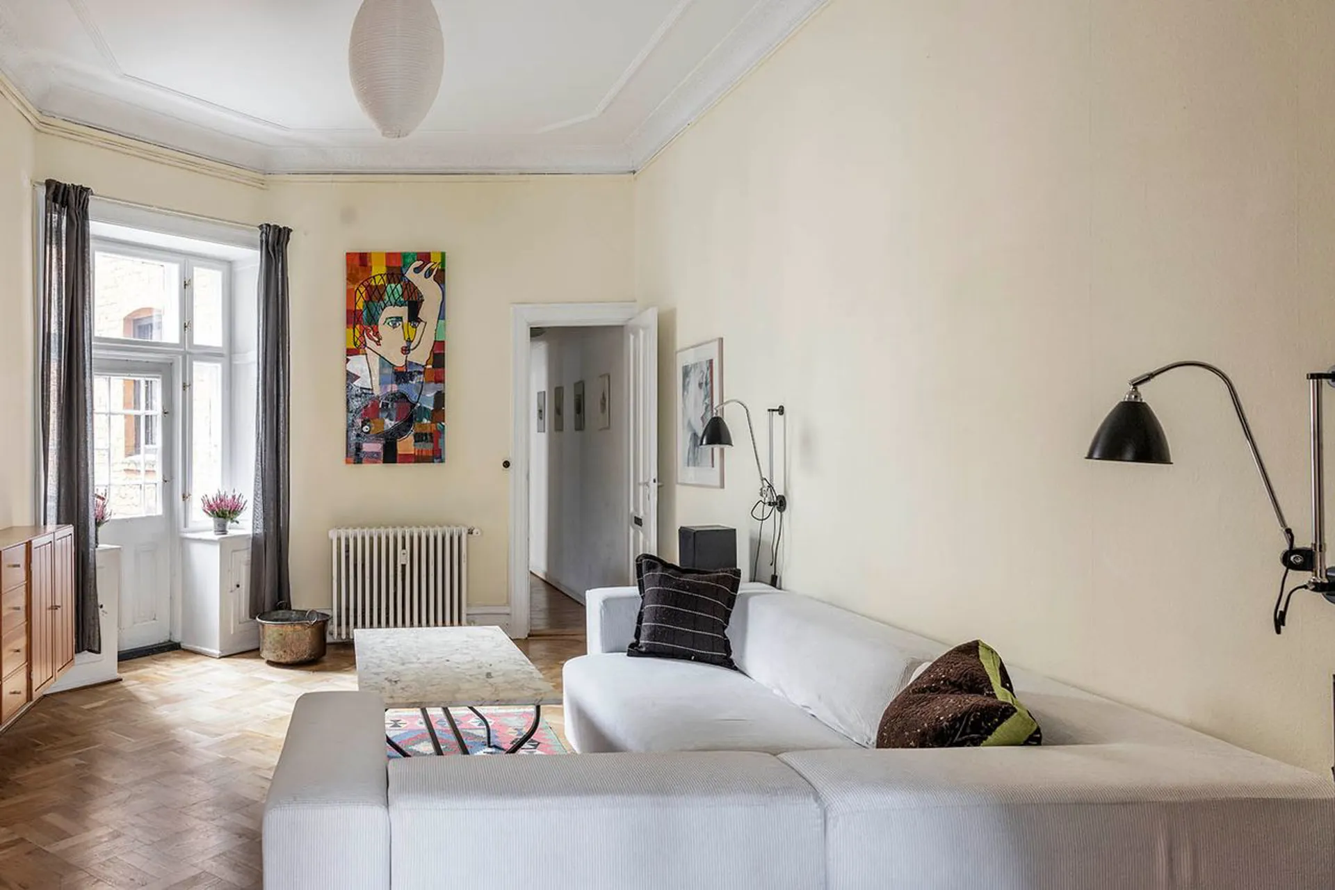Veldisponeret, højloftet og gennemgående klassisk herskabslejlighed på 225 m (BBR). Der er ikke mange, der kan prale af at bo på selveste Trianglen, men her er muligheden. Her er muligheden for udsigt til det monumentære B.T.hus, der i folkemunde kaldes Bien. Henover Bien og i direkte akse er der udsigt til Fælledparkens hovedindgang hvor Statuen ’Genforeningen’ står i sin pragt. Udsigten til Fælledparken efterlader påmindelse om, at et af byens absolut mest storslåede naturområder ligger lige uden for døren.