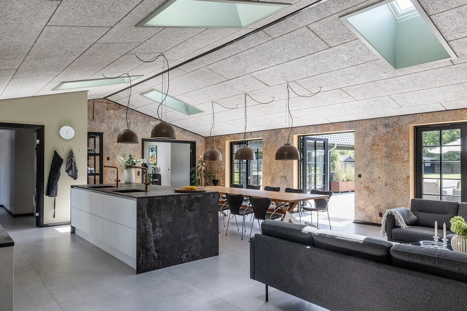 Det store køkken-alrum samler årstider og mennesker, og glider ud i stuen og videre ud til den overdækkede terrasse – hvor aftenerne kan trækkes ud, længe efter solen er gået ned.