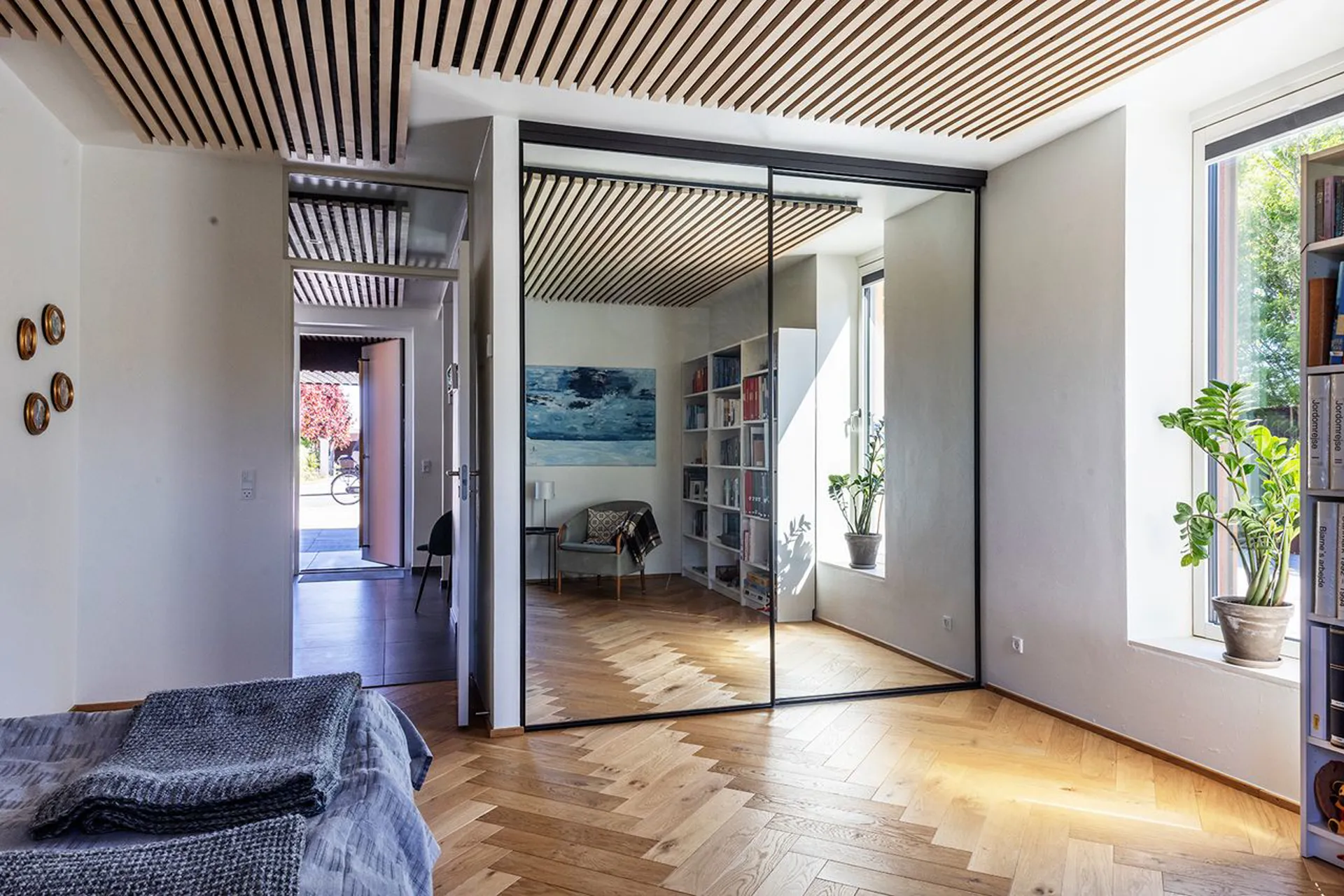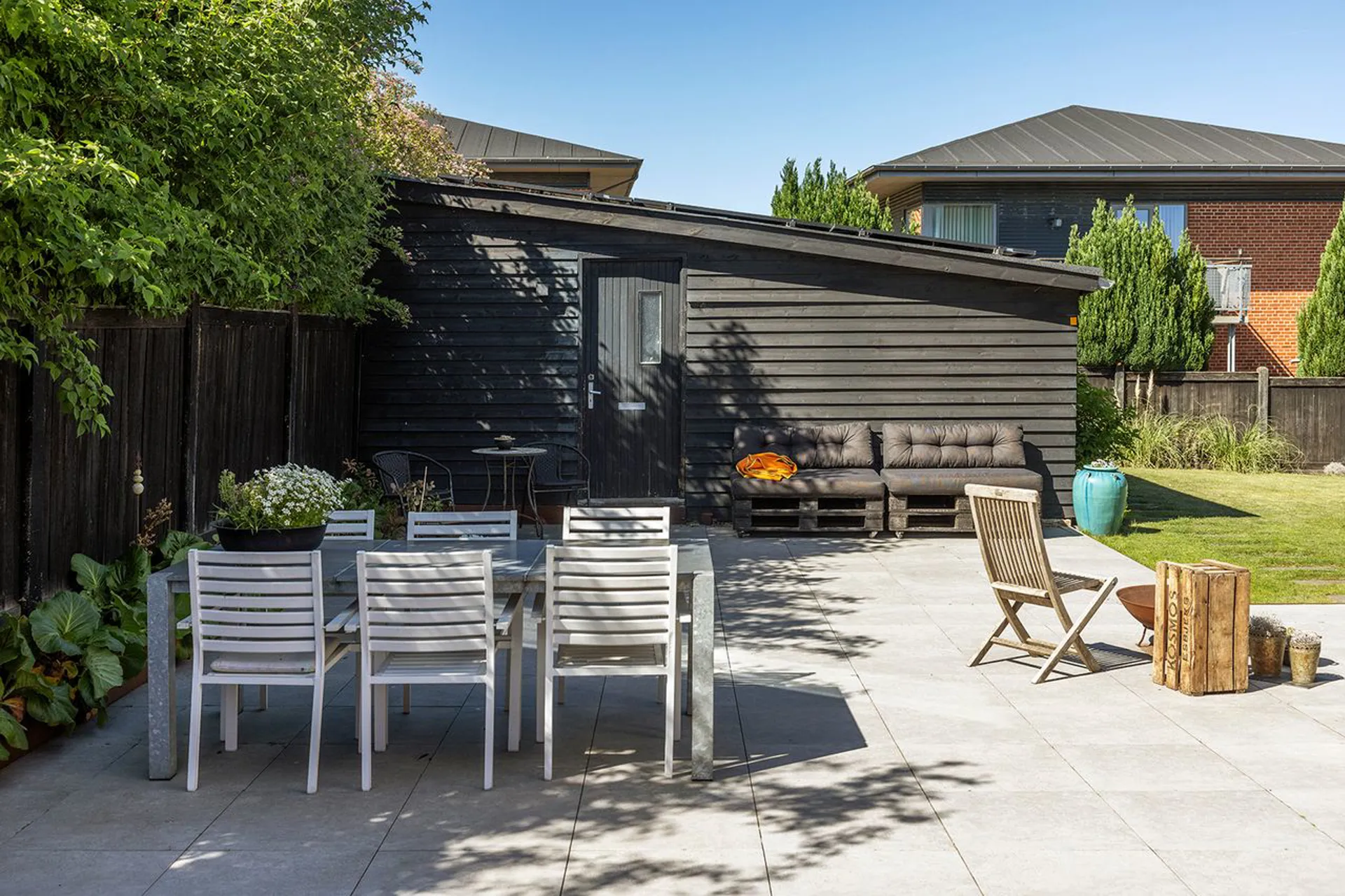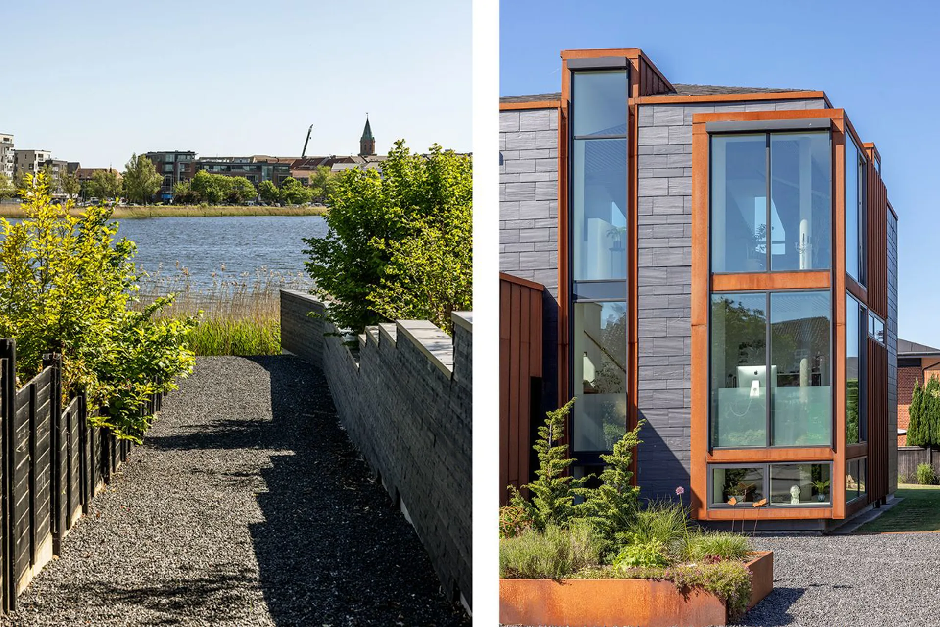 Og så var der lige det med den private adgangsret til søen – lige på den anden side af vejen er der anlagt en skøn sti midt mellem to smukke villaer, som i deres klassiske udtryk netop er med til at understrege dette hus’ kontrastfulde og modige væsen. Og sandheden er, at man i virkeligheden ikke behøver at være særlig modig for at bo i dette hus.