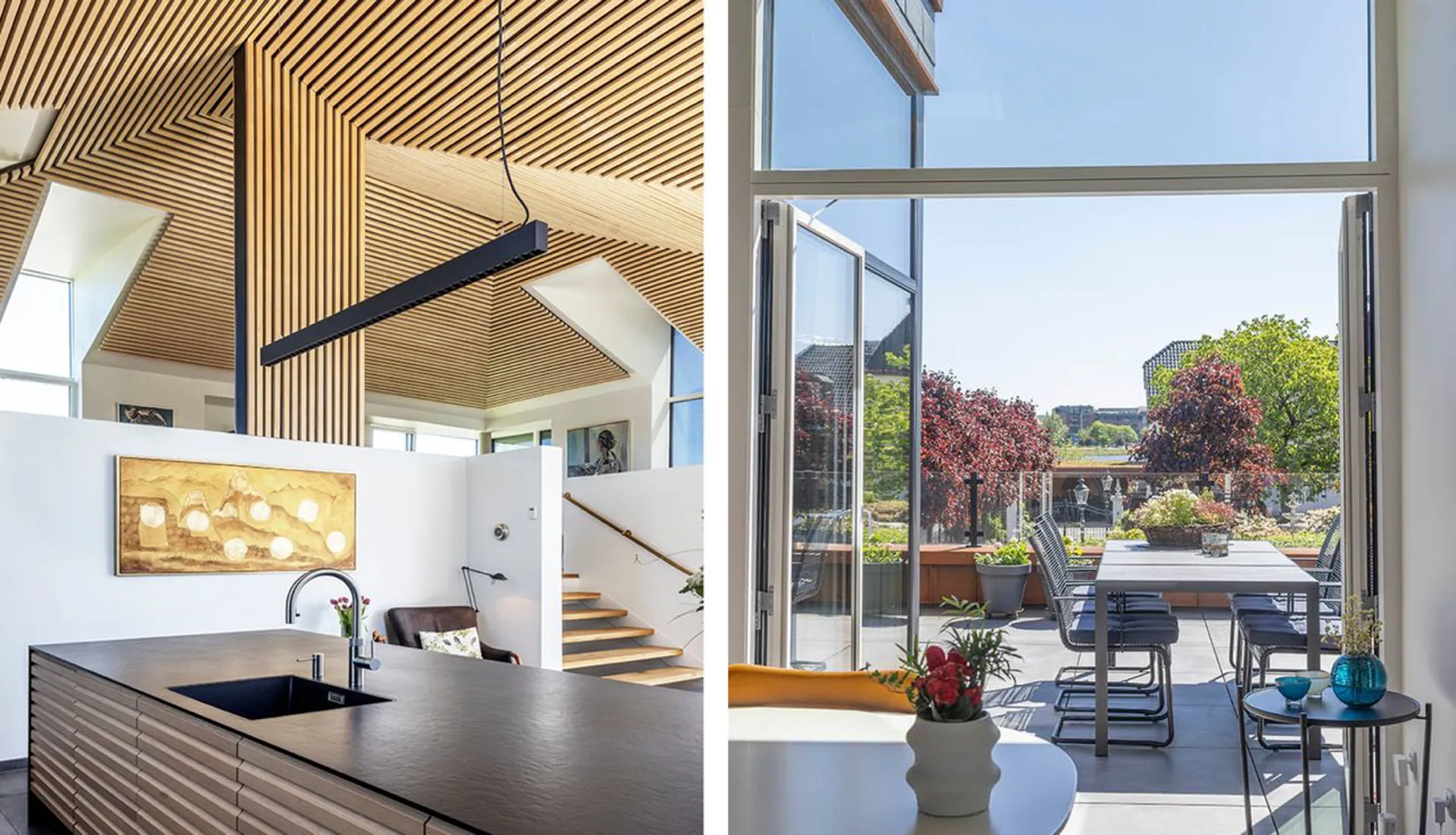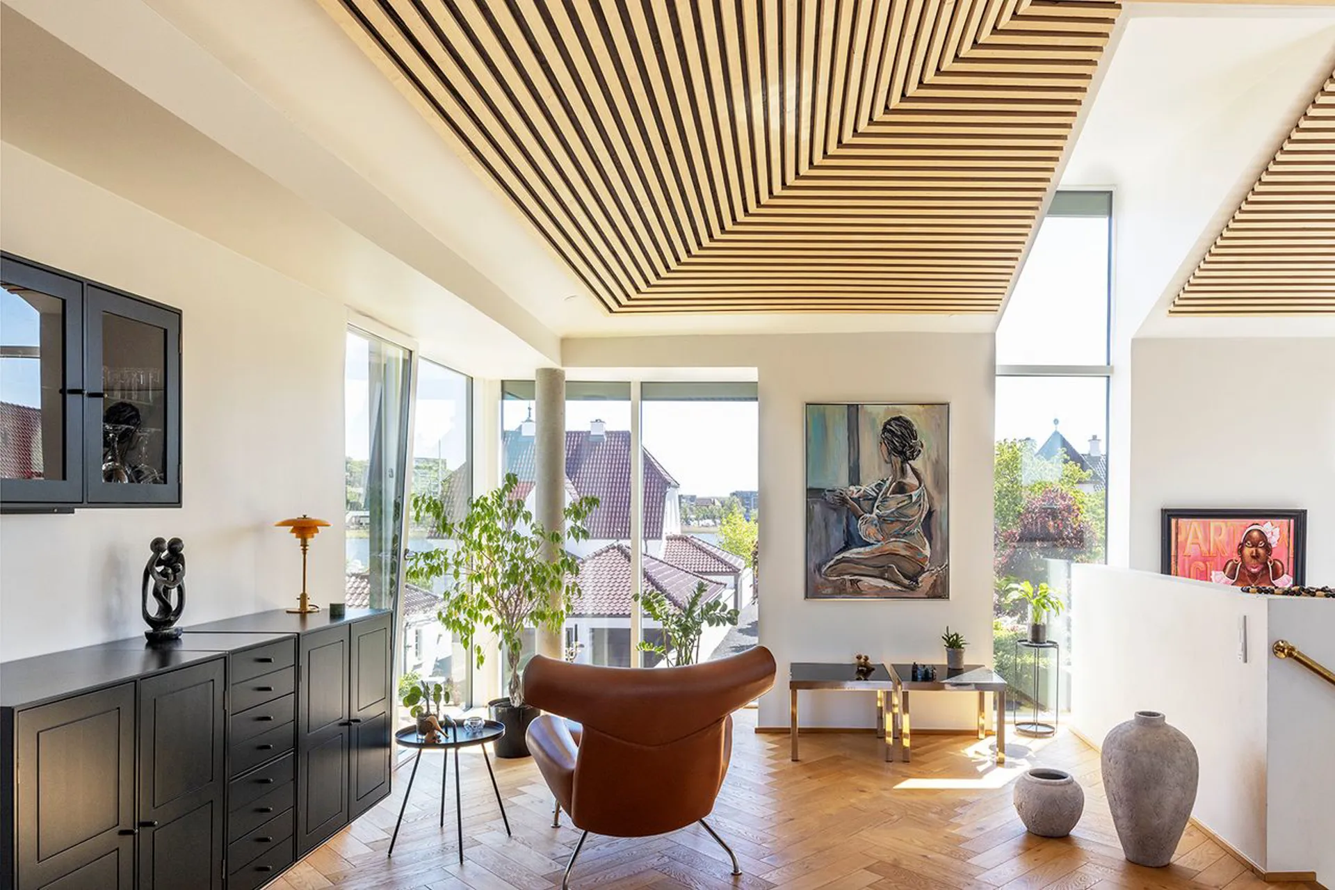 Uwe Reihs benytter sig af et elegant, arkitektonisk greb, hvor halve og hele etager lægger sig forskudt af hinanden. Det skaber en skøn opdrift i bygningen – og det skaber gennemlysninger og luft på tværs af rumligheder. Et greb, der kombineret med en japansk-inspireret, minimalistisk aptering fuldender villaen som et enestående bygningsværk. Omgrænset af solbeskinnede terrasseområder, en skøn have og 35 m² dobbeltcarport ved indgangen til huset.