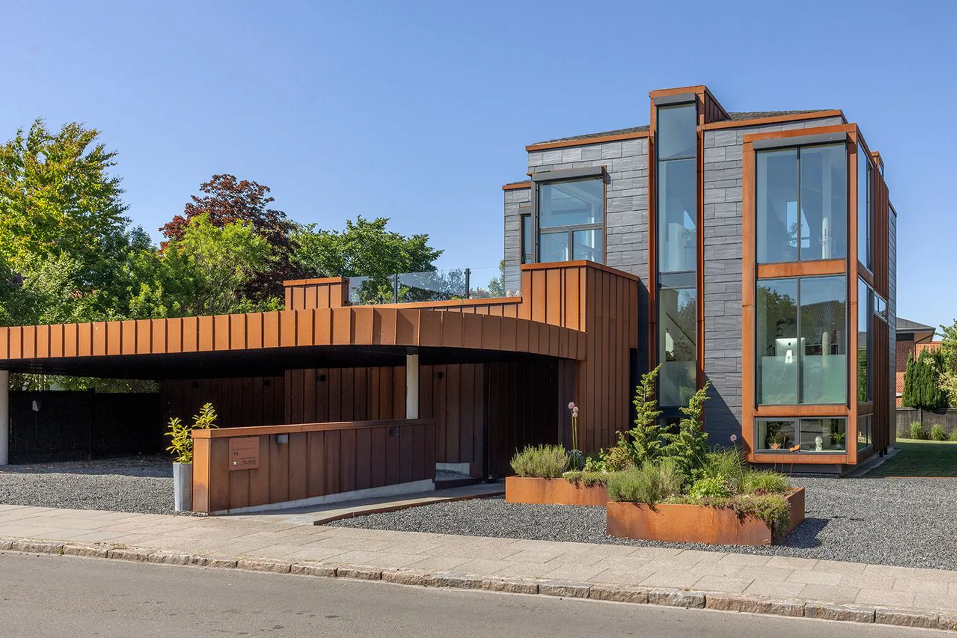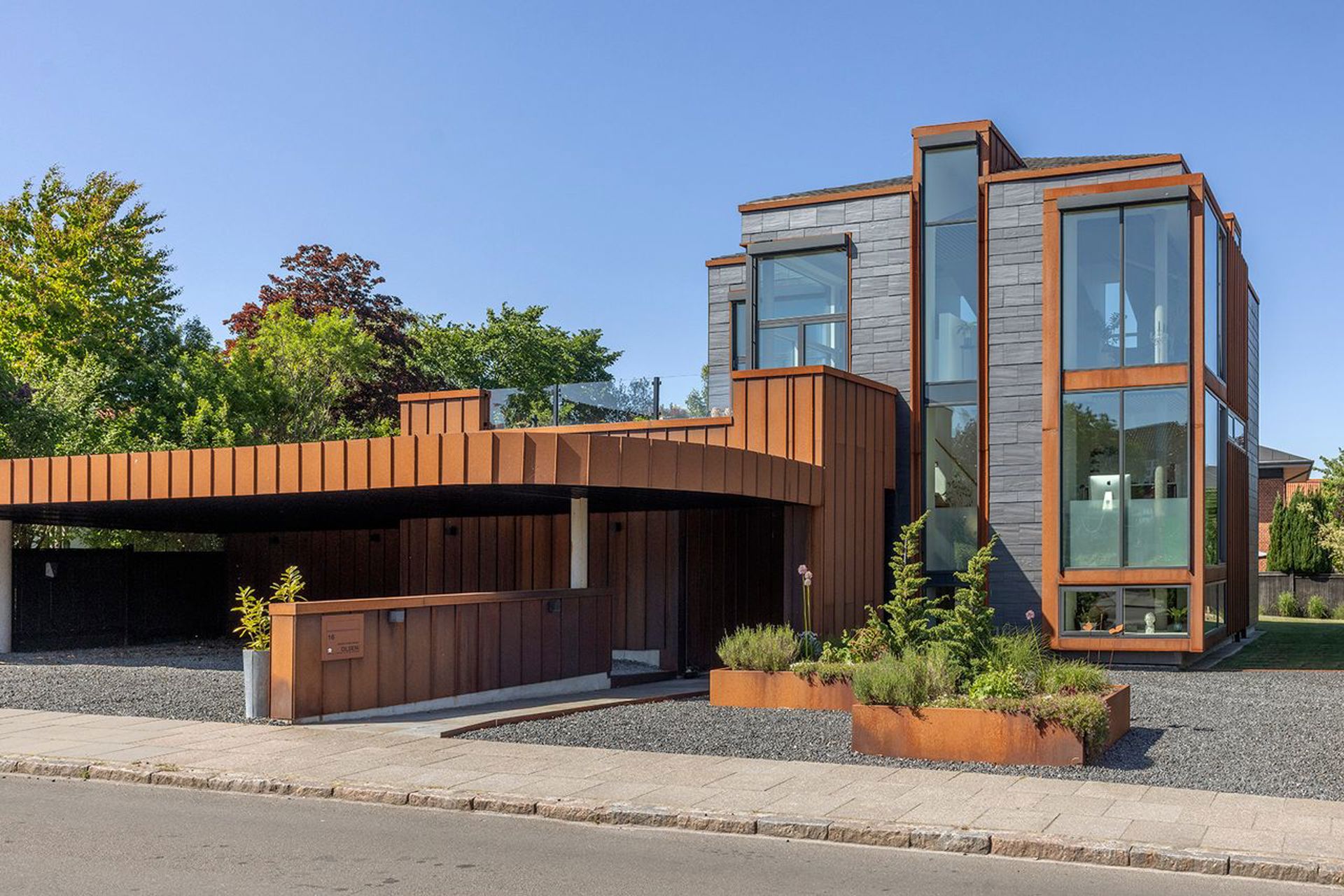 Det vil strække for vidt med en fuldendt beskrivelse af husets tekniske herligheder, men for at nævne nogle elementer, der sætter det hele i perspektiv, så kan villaen bryste sig med et energimærke på A20. Bygningen er funderet på 21 betonsøjler, der sikrer et særdeles gedigent grundlag for de 15 tons stål, der holder bygningen sammen, beklædt med ti tons cortenstål og naturskiffer fra Spanien, der kraftfuldt og meget eksplicit fremhæver husets rustikke, arkitektoniske formsprog. Ja, så kan man jo også lige nævne, at huset er isoleret med 600 mm papiruld i taget, at det er udstyret med Danfoss-ventilationsanlæg og solcellerne på taget, som bidrager til husets meget lave energiforbrug. Og sådan er det hele konstrueret omkring en bæredygtig og komplet tankegang – en drøm om et lavenergihus, der ikke kun imødekommer en omkostningsminimeret hverdag for dem, der bor i huset, men også anerkender den præmis, at vi er i verden på lånt tid, og med al respekt skal tære så lidt som muligt på den, inden vi giver den videre til de kommende generationer.