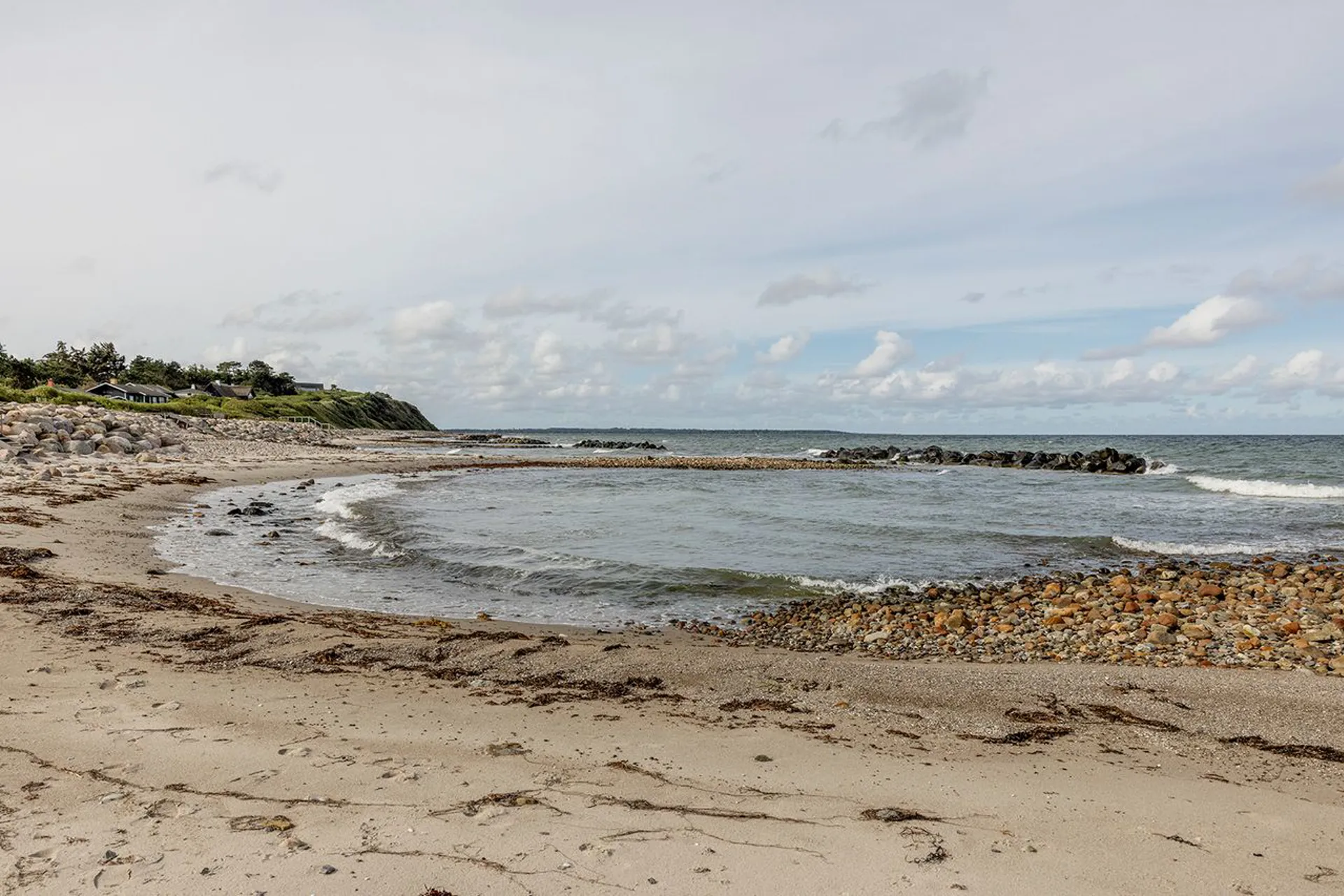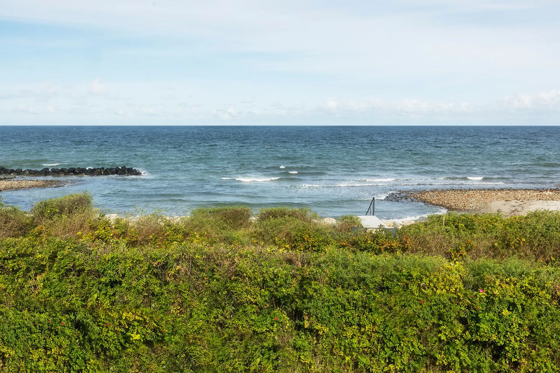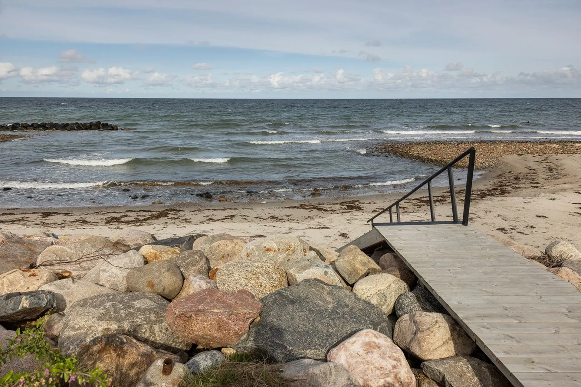Udsigten er intet mindre end betagende – en panoramaoplevelse af strandens bugtede landskab, hvor de skulpturelle bølgebrydere skaber små lommer af roligt vand, perfekt til en kølende dukkert på din private strand.