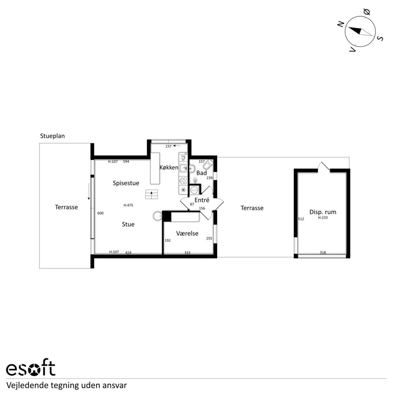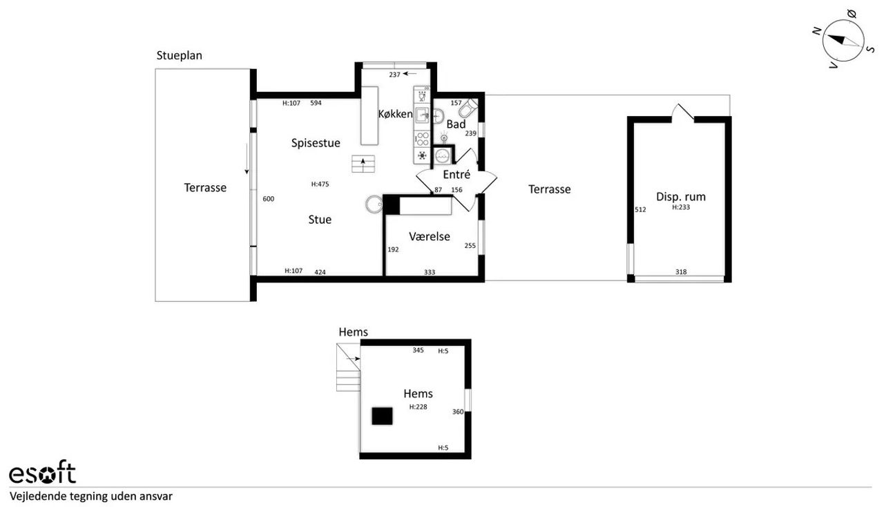 Indretning: Entré, hvorfra der er adgang til både badeværelse med brus, soveværelse med skabsvæg og husets store alrum, der fordeler køkken, spiseplads og opholdsstue i ét åbent højloftet rum til kip. Over badeværelse og soveværelse er der en hyggelig hems, med et enestående kig til ned over Bakkerne med vandet lige dér ude bagved. Annekset er indrettet med dobbeltseng og kontorplads. Fra alrummet er der udgang til stort terrasseområde med sol, horisont og udsigt til vandet – og mellem hovedhus og anneks endnu et terrassedæk, der både giver en skøn ankomst til huset, og en fin forbindelse mellem de to bygninger.