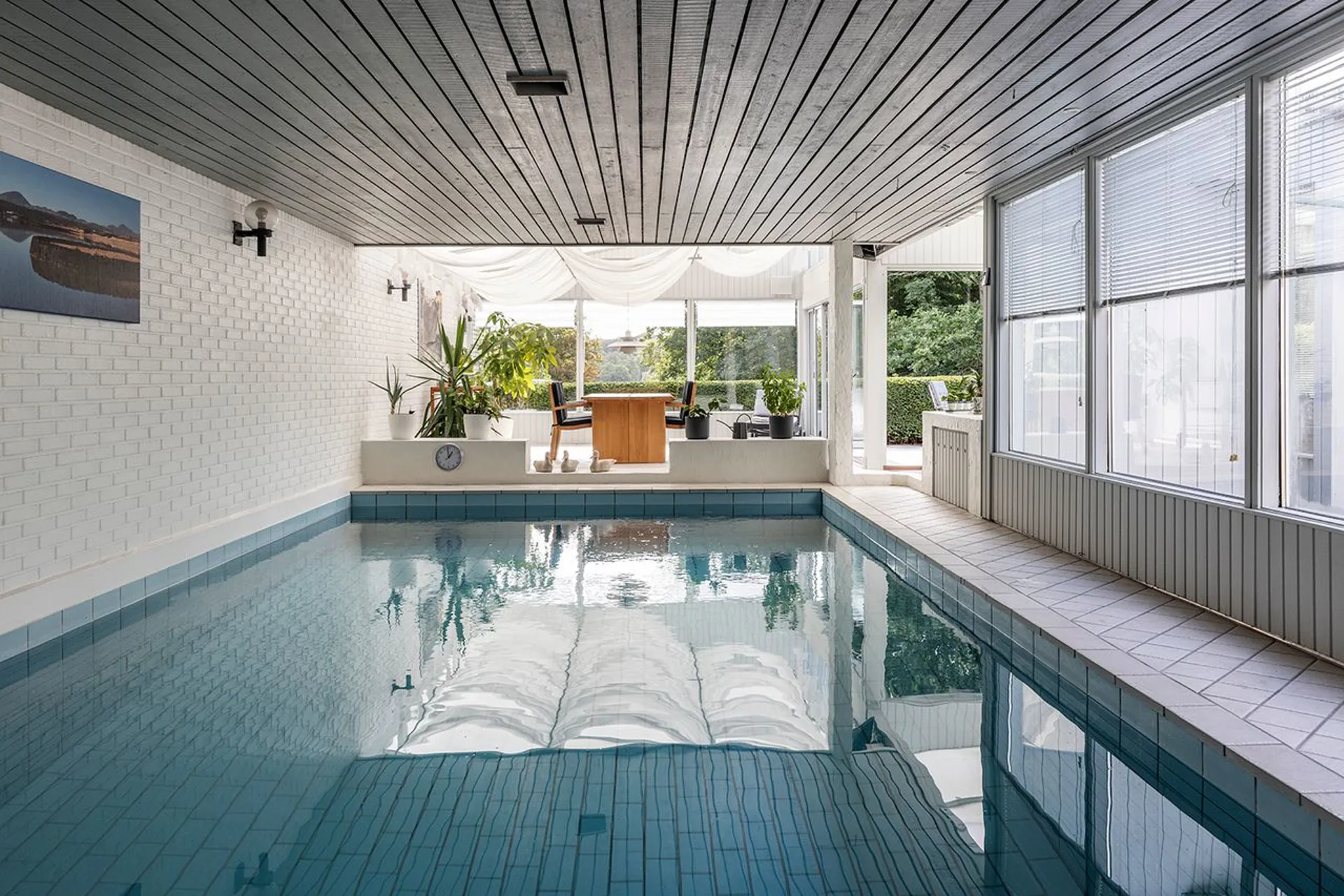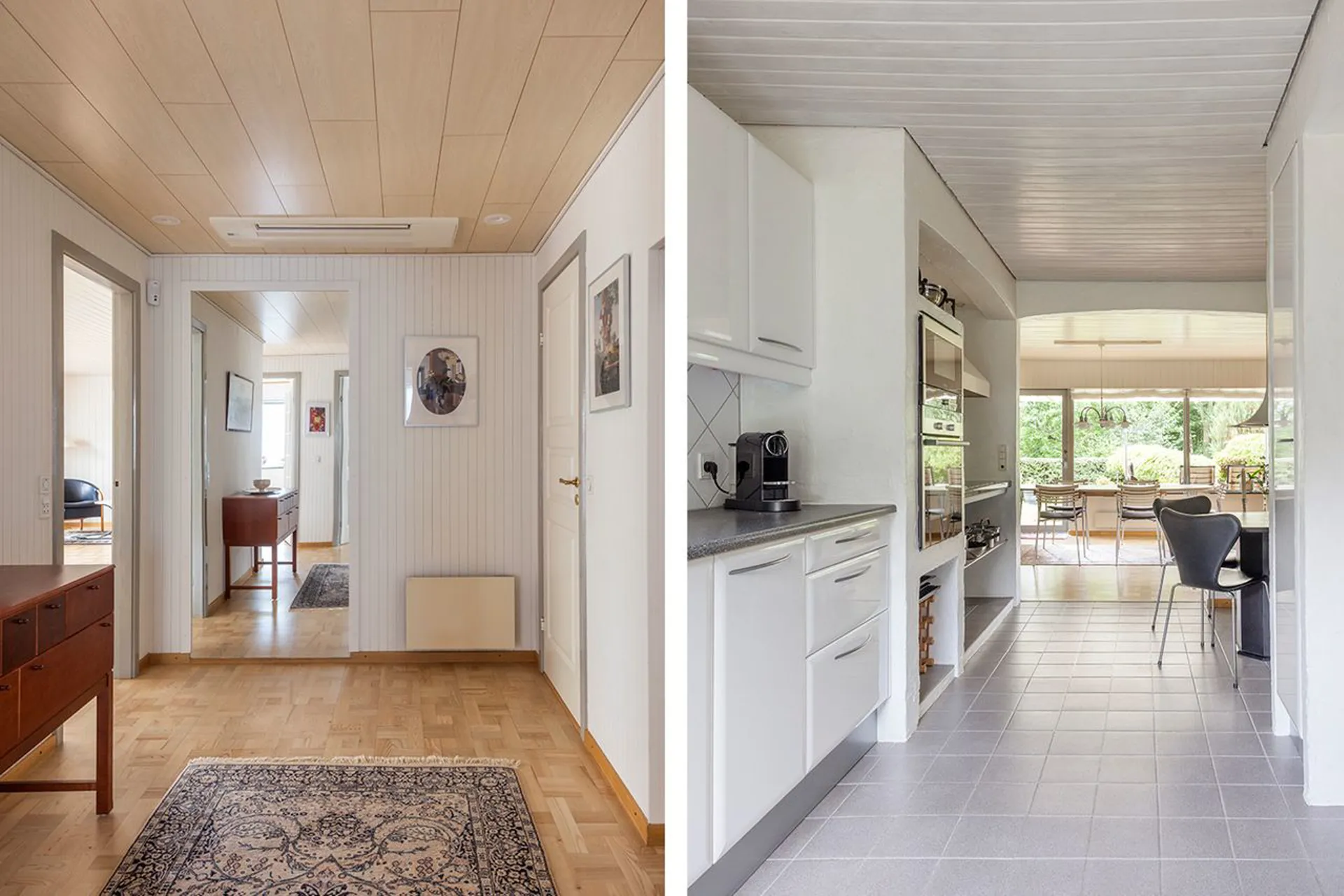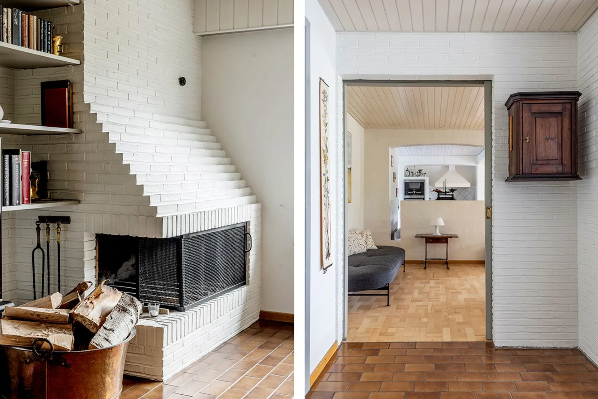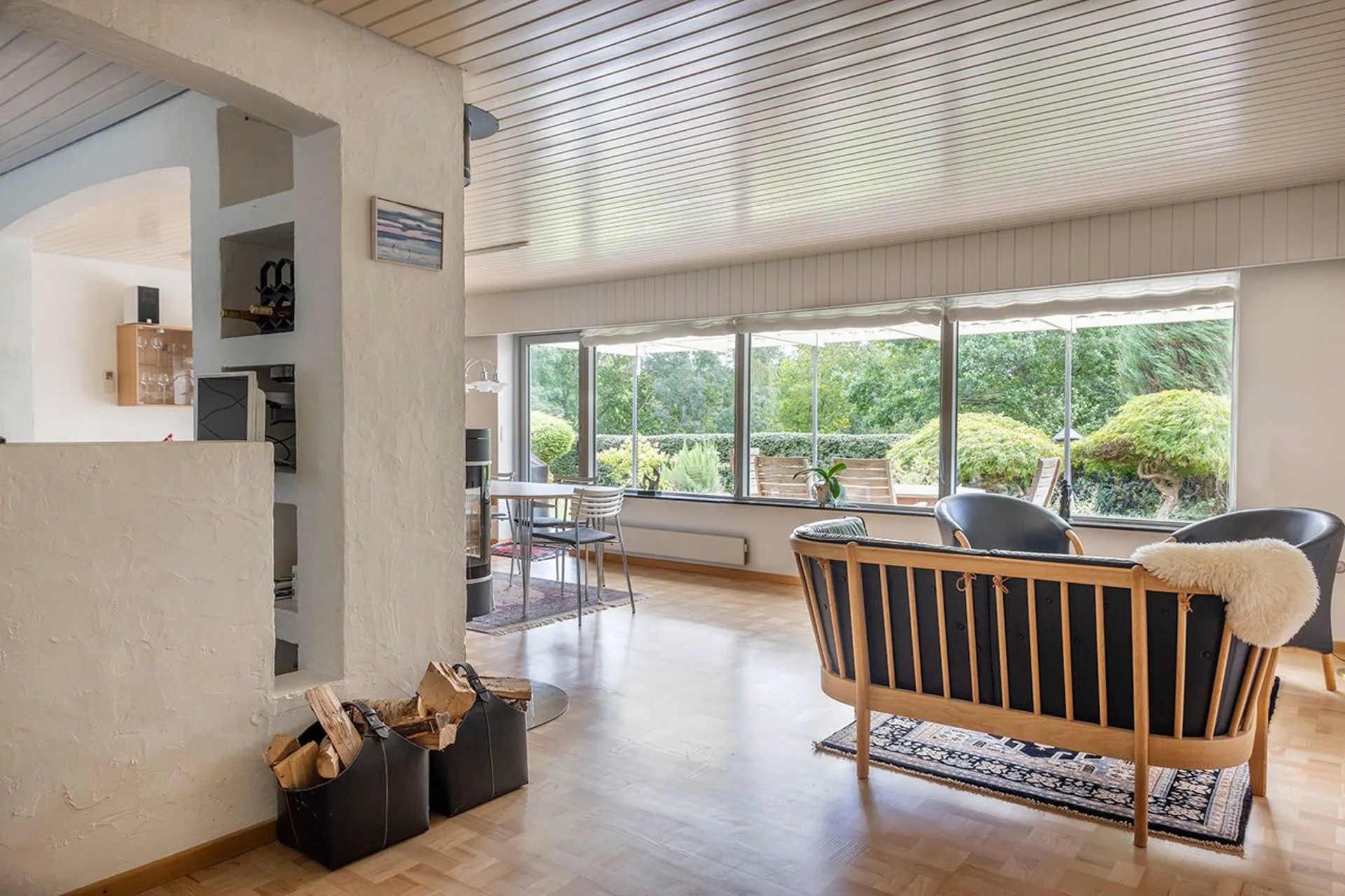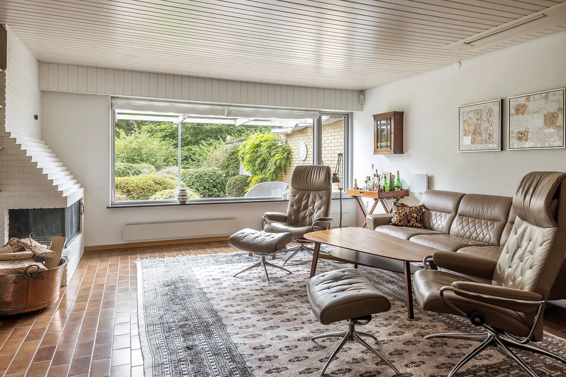 Villaen er fra 1974, hvilket afspejler husets formsprog med klassiske gule mursten, sort tegltag fra 2025 og flotte store vinduespartier som åbner huset op mod syd. Huset har så absolut egen sjæl og arkitektonisk kant med blandt andet en pejs, der er lidt ud over det sædvanlige.