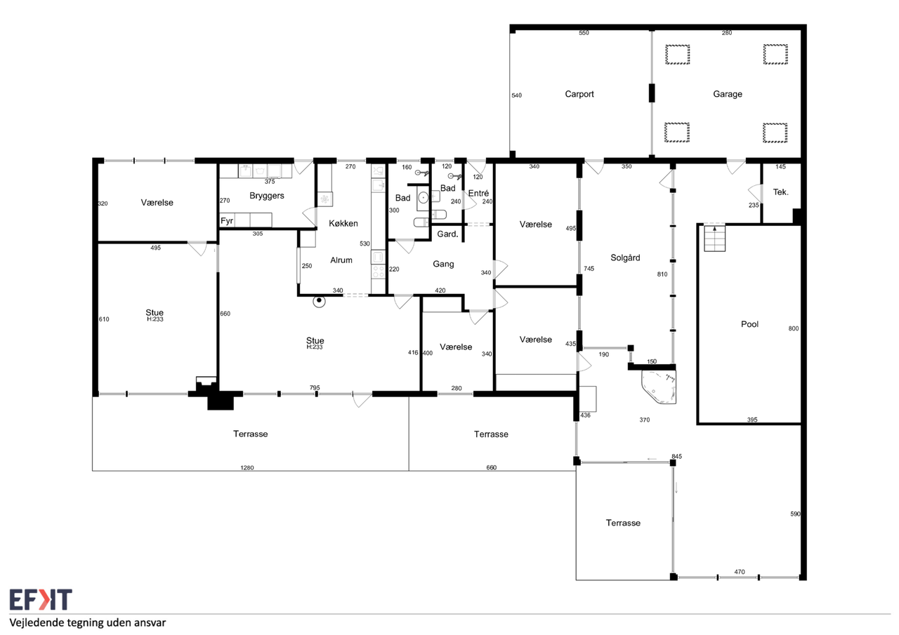 Villaen fordeler sine 200m2 (BBR) ud på et plan, som i hovedtræk består af stort og lyst køkkenalrum med direkte forbindelse til terrasseområdet. God stue, tre værelser, to badeværelser og bryggers. Hertil kommer stilfuldt swimmingpool-område forlænget med spiseplads, liggestole og plads til afslapning, gode stunder og gæstfrihed. Herfra er der udgang til terrasse og have. Ved villaen forefindes også dobbeltgarage.